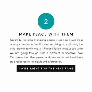 Naturally, the idea of making peace is seen as a weakness or may cause us to feel like we are giving in or allowing the other person to win over us. Reconciliation helps us see what we are going through from a different perspective: how God views the other person and how we should treat them as a response to this newfound information.