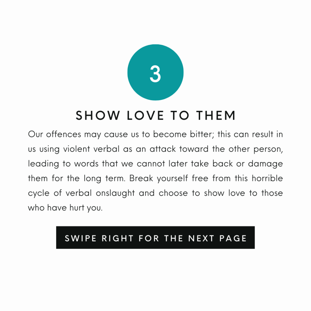 Our offences may cause us to become bitter; this can result in us using violent verbal as an attack toward the other person, leading to words that we cannot later take back or damage them for the long term. Break yourself free from this horrible cycle of verbal onslaught and choose to show love to those who have hurt you.